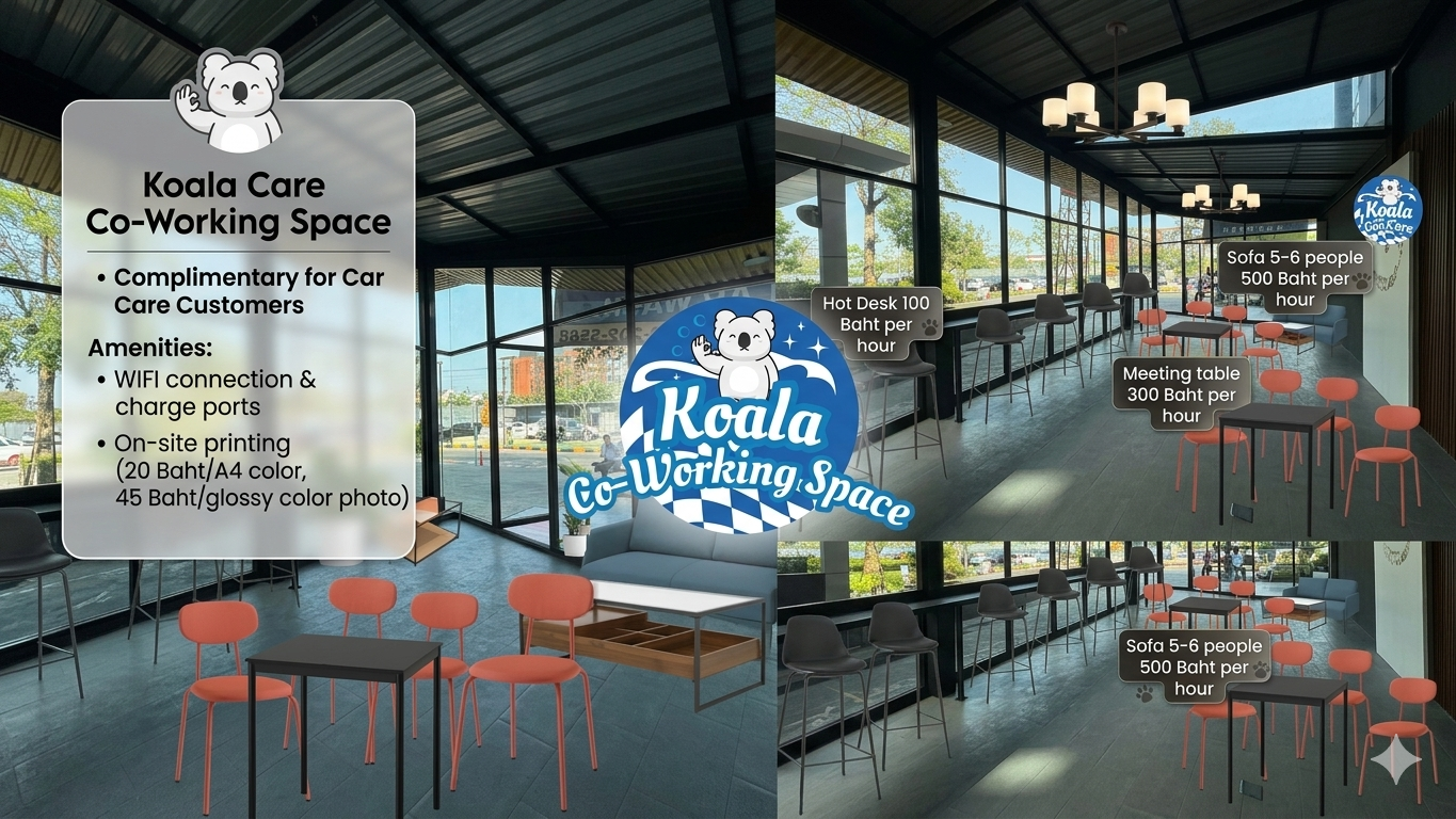 Introducing the Koala Co-Working Space: a sleek, modern professional sanctuary designed so you can crush your goals while we make your car shine. Why waste an hour in a boring lobby when you can be making moves?